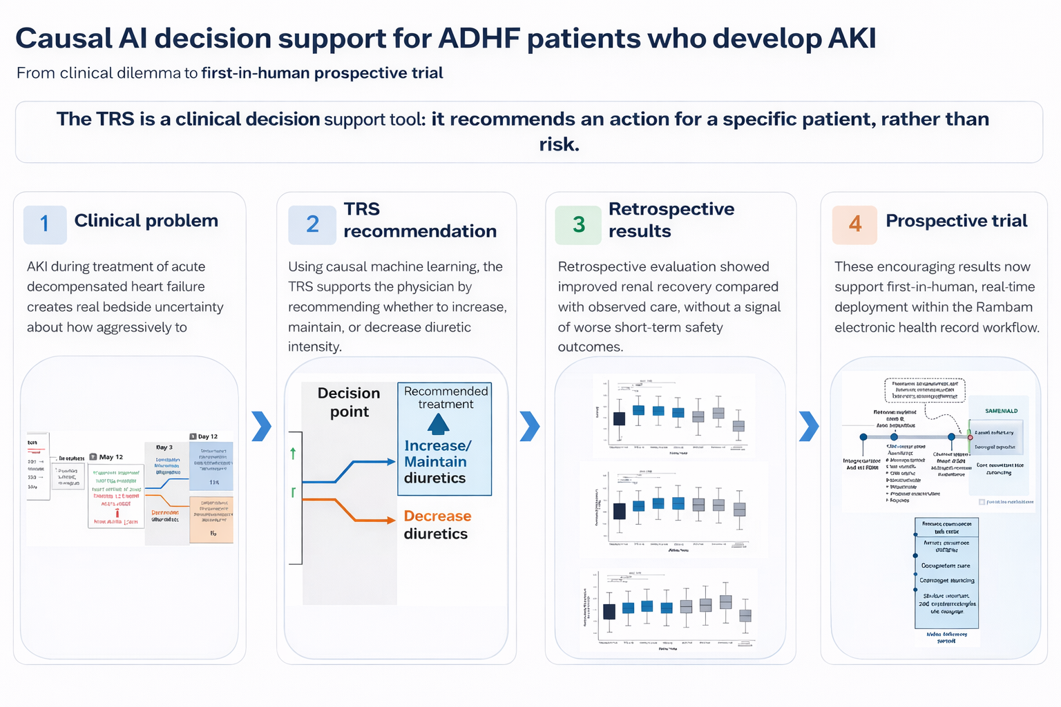 The collaboration has already produced strong retrospective results supporting prospective clinical testing. In retrospective analysis from Rambam, the TRS improved renal recovery outcomes compared with observed standard care, without adversely affecting in-hospital mortality or 30-day rehospitalization/death in the model-based evaluation. The system was developed using rich real-world EHR data and more than 200 structured clinical variables. Beyond the retrospective work, the team has also prepared the infrastructure needed for clinical translation, including physician review of TRS recommendations, development of a user interface designed for clarity and adoption, and planning for integration into Rambam’s EHR. In parallel, the team developed a physician-facing user interface in collaboration with clinicians. The interface presents the patient’s clinically relevant information together with the TRS recommendation in a clear, intuitive format designed for real-time use in the hospital workflow. These achievements are now serving as the basis for a first-in-human, prospective, stepped-wedge randomized clinical trial of a causal decision support system in real-time practice.