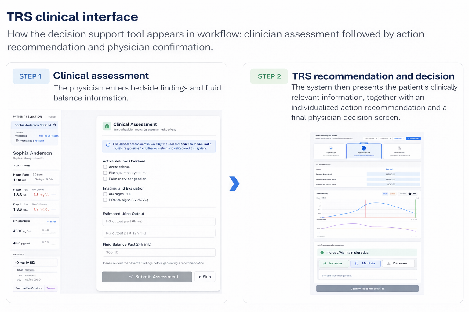 This project addresses that dilemma through a clinical decision support tool, the Targeted Recommendation System (TRS). Importantly, the TRS is not a prediction model. Instead, it is a causal machine-learning system designed to support action: it evaluates patient-specific clinical data and recommends the most appropriate treatment strategy at the bedside. At the key clinical decision point, the system can recommend whether diuretic intensity should be increased, maintained, or decreased, and it can also defer when confidence is limited. By focusing on treatment effect rather than simple risk prediction, the TRS is designed to help physicians choose what to do, not merely predict what might happen.